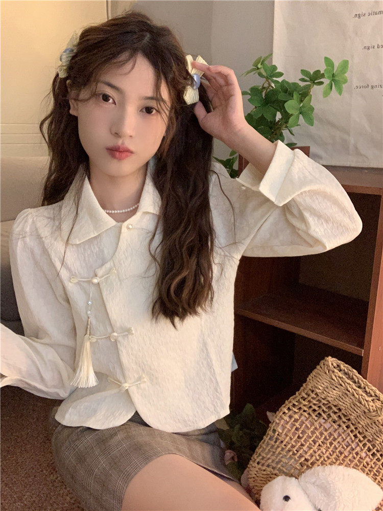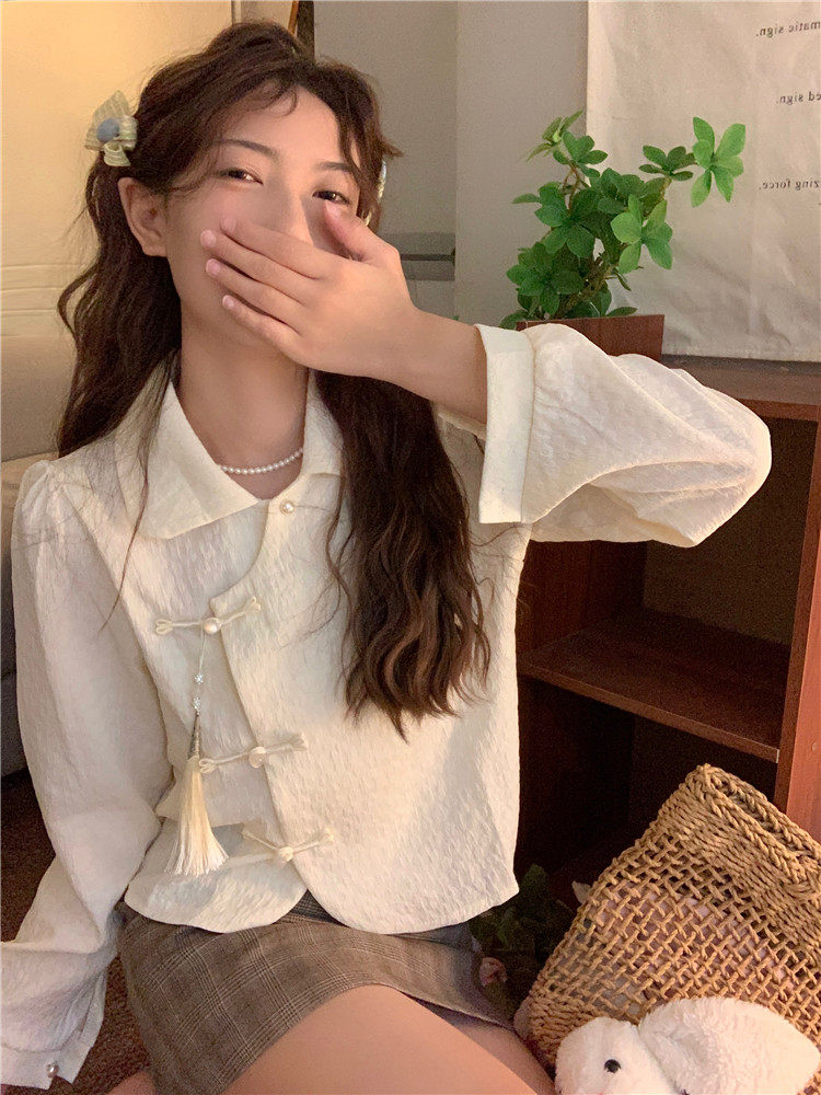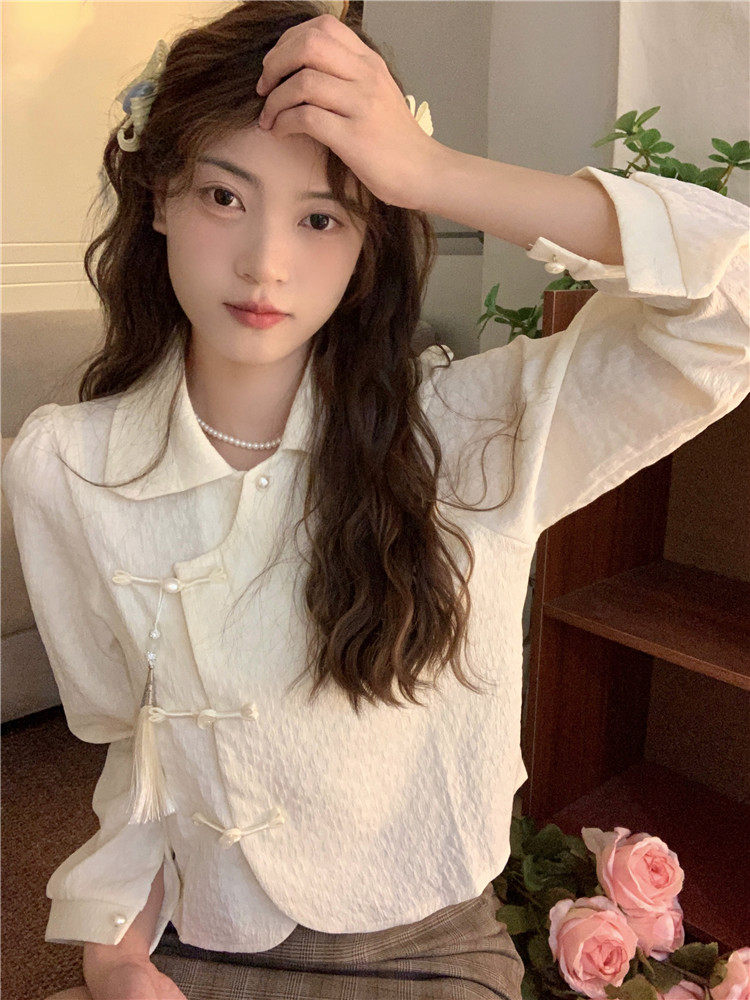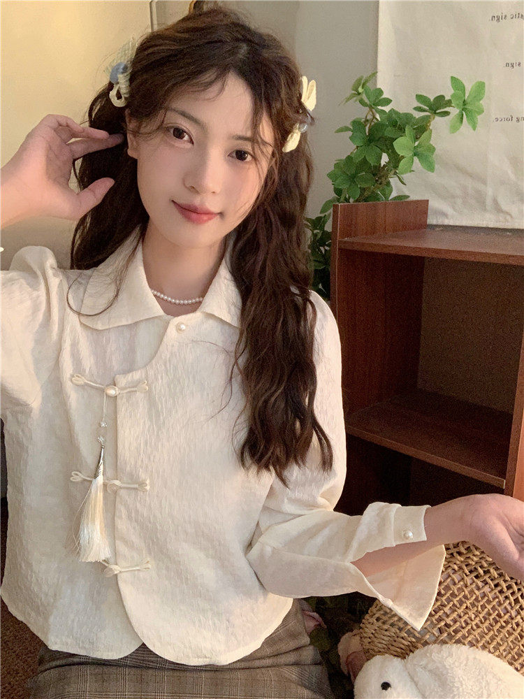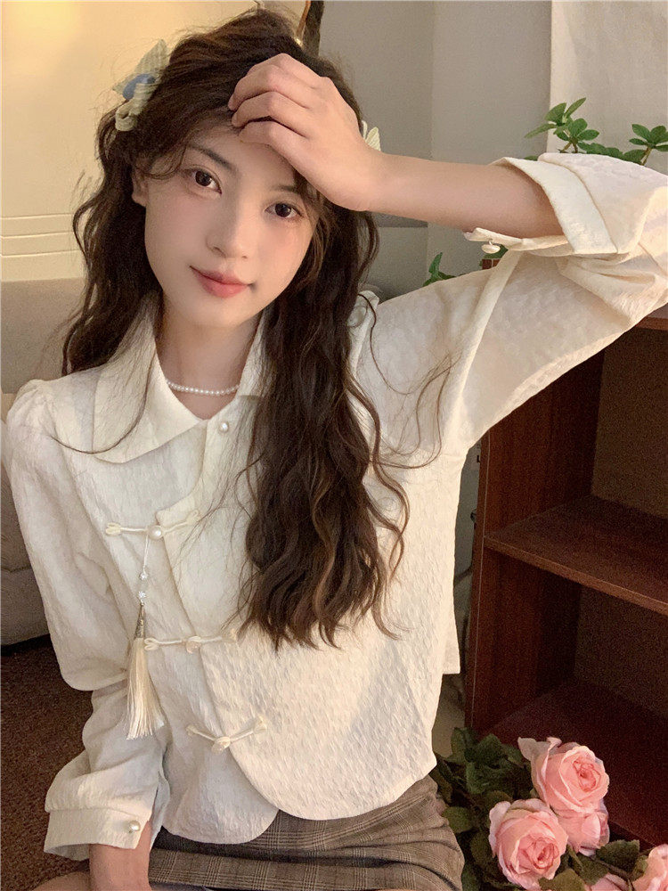 • 商品名称:新中式中国风盘扣长袖衬衫女装娃娃领短衬衣春秋季款搭马面裙上衣