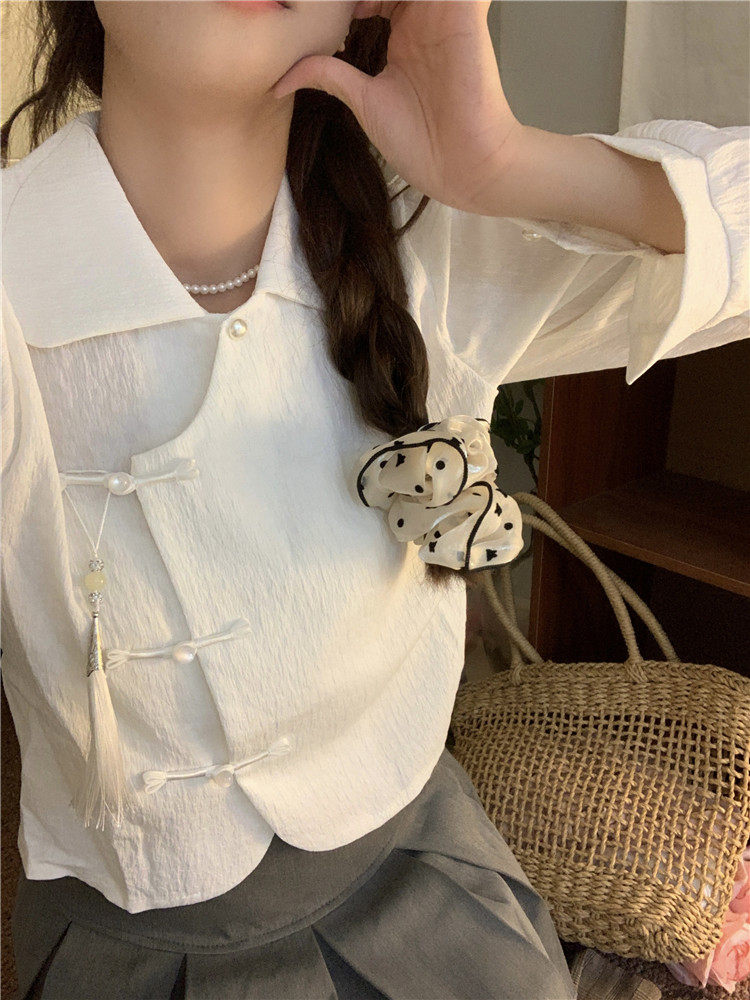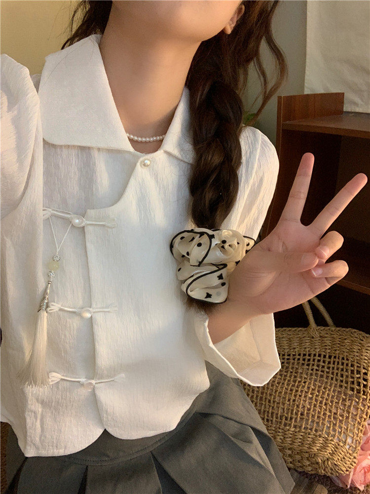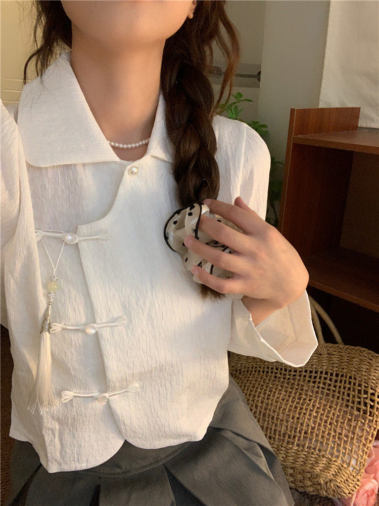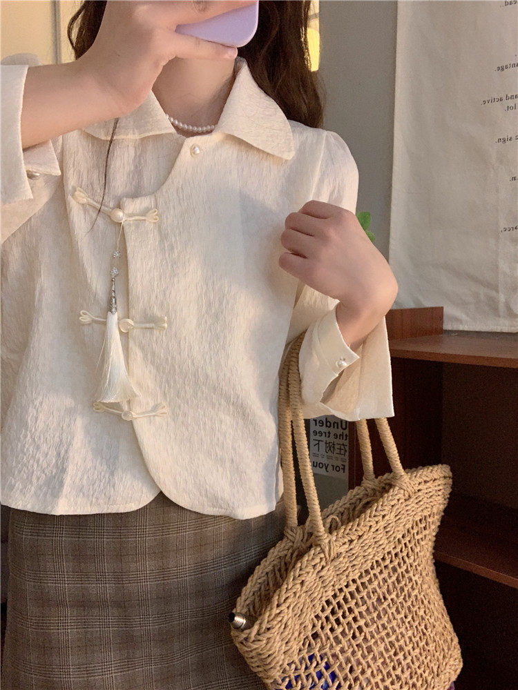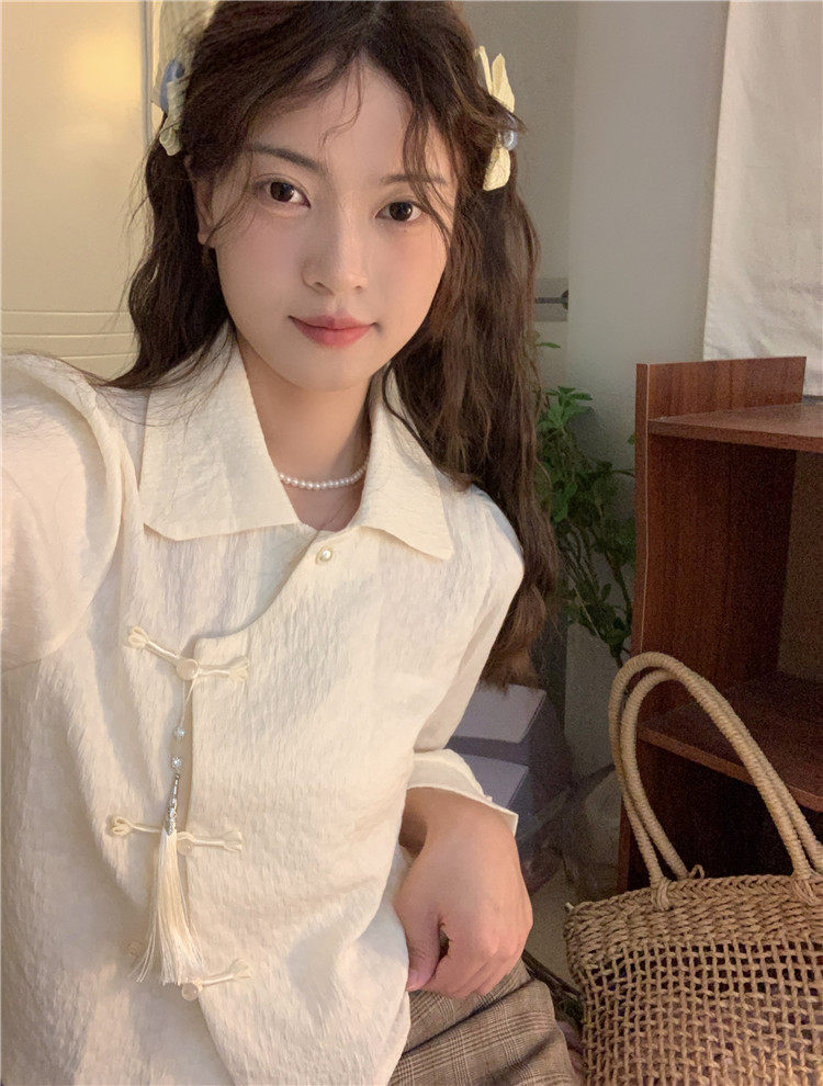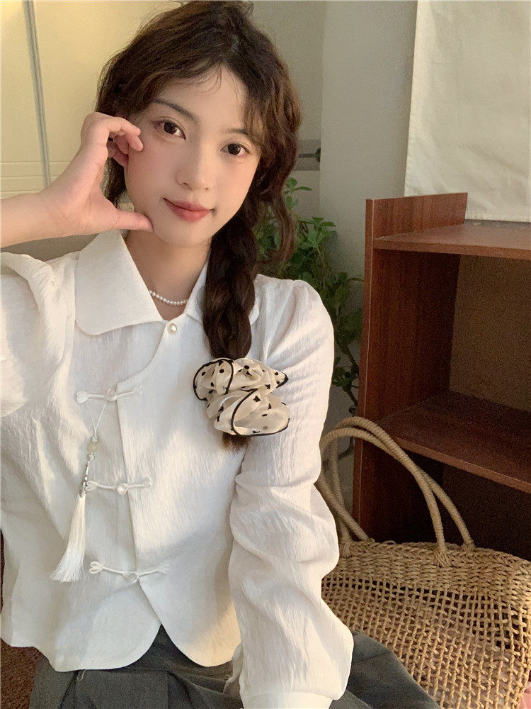 • 商品名称:新中式中国风盘扣长袖衬衫女装娃娃领短衬衣春秋季款搭马面裙上衣