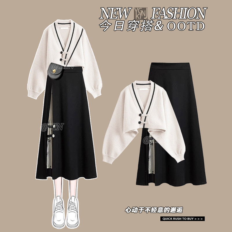 • 商品名称:黑色国风新中式半身裙女冬季新款设计感针织开衫披肩毛衣两件套裙